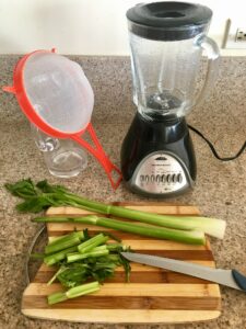 My partner and I have created a lifestyle that is downstream and a complete package of holistic management for psoriasis and anxiety. This means that my early mornings are filled with preparing breakfast! By my Human Design, I do well with Intermittent Fasting, thus, morning time is all about liquids. I start on an empty belly with fresh celery juice. I blend 2-3 stalks with a cup of water then strain it.