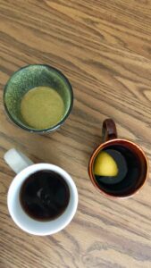 Next, I move on to warm lemon water to prime digestion before I sit down at my “office” (currently our dining room table) to sip on my vegan protein shake and black coffee (depending on my mood I usually add a bit of collagen protein, ghee, or coconut oil to my coffee for some health benefits).