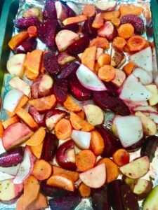 One of my favorite go-to recipes, especially in autumn and winter, is a super simple root vegetable roast. I love beets, red or purple potatoes, onions, and carrots (you can literally add any other hearty veggie here)! I cut them into bite-sized chunks, lather them up with either coconut, avocado, or grapeseed oil (these oils are more stable at high temperatures) and season them with an herb seasoning salt, pepper, and whatever other spices I feel like grabbing at that time. Bake at 350 degrees for about 40ish minutes and voila!
