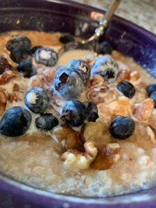 During workdays, I stay mindful of my activity level and water intake. Both are easy to neglect when inundated with projects and desk-bound teleconferences. I integrate these concepts into client calls, newsletters, and blog content. If I have a live client discussion, I bring that person into my office, always offering water and having healthy snacks at arm’s length. My afternoon go-to is oatmeal, blueberries, and pecans.