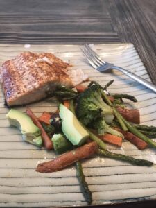 Time for dinner. Tonight we are having baked salmon and veggies. I love roasting veggies because it brings out their natural sweetness and is SO good for you. It is also the only way I can get my kids to eat veggies. I usually do carrots, zucchini, broccoli, sweet potatoes, asparagus, and cauliflower. I chop everything and put in a gallon zip lock bag with 1 tbsp cinnamon, 1 tbsp pure vanilla, and 2 tbsp of grape or olive oil. Bake on 450 for 20 mins. Top this with your protein of choice, 2 tbsp of nuts and seeds of choice, ½ chopped avocado, and some grape tomatoes. I also make a yummy vinaigrette to put on it which is 1 tbsp olive oil, 2 tbsp apple cider vinegar, 1 teaspoon mustard, and 1 teaspoon pure maple syrup, mix and use about 1-2T on your veggies. Yum!